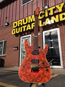 The M-II is an aggressive and modern design that takes no prisoners in playability or tone. This guitar was debuted at the NAMM show in Anaheim, CA and is the only one ever made, so it is truly a unique one-of-a-kind guitar. This one is loaded with EMG's popular and powerful active 81X/85X pickup combination and a Floyd Rose Original tremolo bridge and locking nut, set up for your most technical excursions.